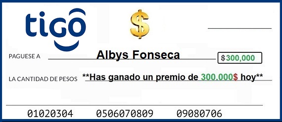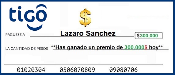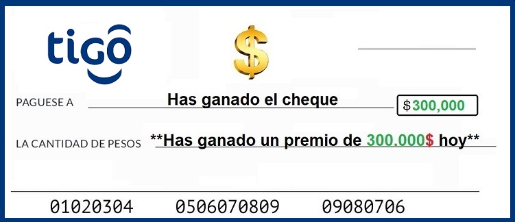 Felicitaciones, parece que Tigo escogió el dispositivo de escritura ( ) al azar, no lo conocemos personalmente, pero queremos agradecerle por su lealtad a nuestro servicio y queremos que sepa que hoy tiene mucha suerte de haber ganado un Un cheque por 300.000 mil dólares estadounidenses.